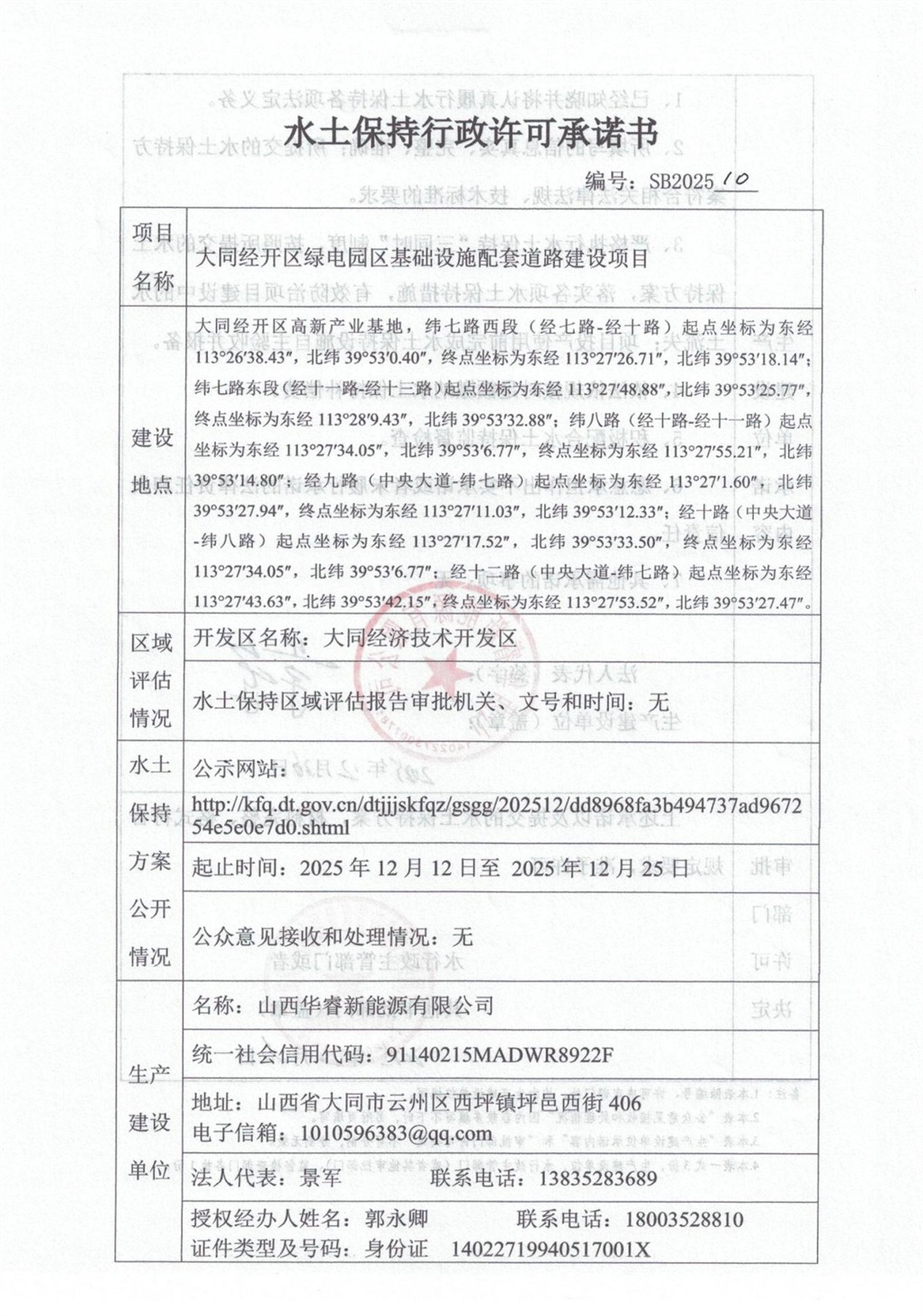 你单位《关于“大同经开区绿电园区基础设施配套道路建设项目水土保持方案报告书”报批的申请》(华睿新能源〔2025〕29号)及所附《大同经开区绿电园区基础设施配套道路建设项目水土保持方案报告书》、《水土保持行政许可承诺书》(SB202510)收悉。经审查,该申请符合法定条件,根据《中华人民共和国行政许可法》第三十八条第一款、决定准予水土保持行政许可承诺。